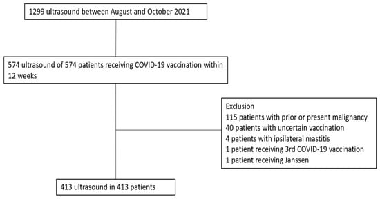 A total of 1299 patients underwent breast–axilla ultrasonography at our institution between August and October 2021. Among them, we selected 574 patients who received COVID-19 vaccination within 12 weeks before ultrasound examination. We excluded patients with uncertain vaccine type or date of vaccination (n = 40), any malignancy (n = 115), and ipsilateral mastitis (n = 4). Further, one patient who received the Janssen vaccine and one patient who received three doses of the Pfizer vaccine were excluded because of their small number, which might have been difficult to analyze statistically (Figure 1).