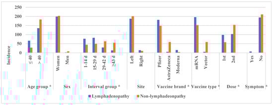 The incidence of axillary lymphadenopathy after COVID-19 vaccination on mammography is reportedly 3%, and the presence of symptoms and a shorter time after vaccination were associated with lymphadenopathy on mammography []. However, the incidence of axillary lymphadenopathy on ultrasound following COVID-19 vaccination has not yet been reported in a large number of cases, and only case series have been reported [,]. Further, although studies have been conducted, these only focused on sonographic findings of axillary lymphadenopathy, and not on the incidence or factors associated with vaccine-related lymphadenopathy [,].