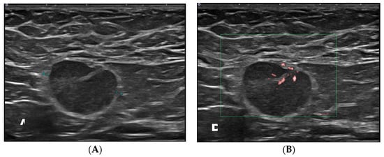 A 37-year-old woman with axillary lymphadenopathy on ultrasound 15 days after the first Moderna vaccination in the left arm. (A) Gray scale ultrasound shows a 1.8 cm round enlarged lymph node with an obliterated fatty hilum in the left axilla. (B) Doppler study shows hilar vascularity of lymph node in the left axilla.