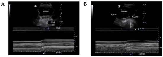 - Martínez-Bustelo, S.; Ferri-Morales, A.; Corral-Gómez, L.; Castillo-García, F.J.; Castro-Varela, V.; Jácome, M.A. Transabdominal ultrasound to assess the displacement of the bladder base during abdominal and pelvic floor contractions in continent parous versus nulliparous women. Int. Urogynecol. J. 2021. online ahead of print. [Google Scholar] [CrossRef]