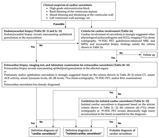 The most commonly used diagnostic criteria for cardiac sarcoidosis are the 2014 Heart Rhythm Society Expert Consensus Statement on the Diagnosis and Management of Arrhythmias Associated with Cardiac Sarcoidosis (see Table 1) [16] and the revised Japanese Ministry of Health and Welfare criteria (see Table 2 and Figure 1) [4,17]. In both criteria, cardiac sarcoidosis can be definitively diagnosed based on the presence of extracardiac sarcoidosis in conjunction with other clinical, laboratory, and radiological findings that suggest cardiac involvement. Endomyocardial biopsy is recommended in the patients who lack histologic confirmation of extracardiac sarcoidal granulomas (in cases with isolated cardiac sarcoidosis or systemic sarcoidosis without apparent endomyocardial biopsy findings). However, the sensitivity is low owing to sampling errors that may occur due to the patchy distribution of the disease.