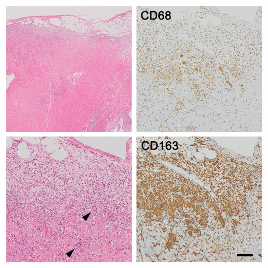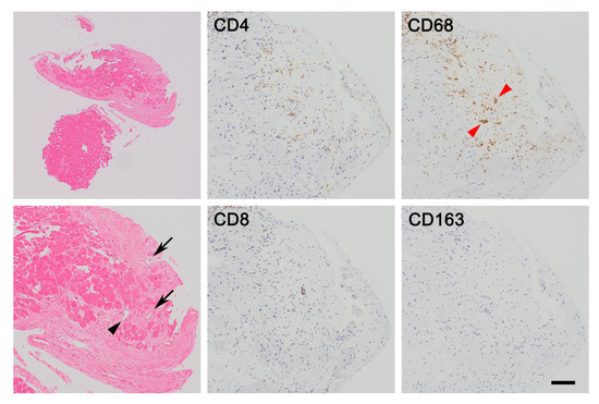 Granulomatous phase of cardiac sarcoidosis. Well-formed noncaseating granulomas (arrowhead) are composed of aggregates of tightly clustered epithelioid macrophages, often with multinucleated giant cells of Langhans and foreign-body types. Few CD4+ helper T cells are surrounded by granulomas, and they are often described as “naked granulomas”. Most of macrophages and giant cells accumulated express CD68+ CD163− M1 phenotype. Bar = 250 μm for a lower magnification field, 100 μm for higher magnification fields.