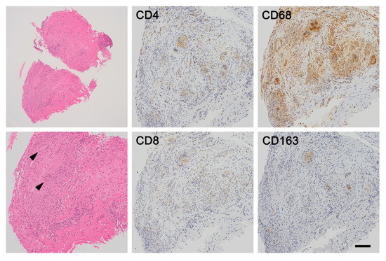 Although the antigenic cause of sarcoidosis has not been elucidated, most pathologists believe that sarcoidosis is caused by an antigen-driven immune response and that the initial trigger involves antigen-presenting cells such as dendritic cells and macrophages presenting the unknown antigen to lymphocytes. Accordingly, CD4+ helper T cells are predominantly recruited, expanded oligoclonally, activated, and polarized into the T helper 1 (Th1) phenotype, which results in a CD4/CD8 T-cell ratio of approximately 10:1 [18,19,20,21]. Thereafter, lymphocyte infiltration, interstitial edema, and subsequent accumulation of CD209+ dendritic cells and CD68+ macrophages are caused by T-cell-derived Th1 cytokines such as interleukin (IL)-2 and interferon (IFN)-γ, which progress into histiocytic myocarditis. Most accumulated macrophages are CD68+ CD163− pro-inflammatory macrophages (M1 macrophages), whereas CD68+ CD163+ anti-inflammatory macrophages (M2 macrophages) are less often observed [22,23].