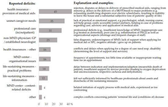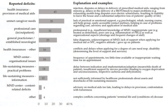 Overall, the majority of reported deficits were related to aspects of care lying outside the specialized neurologists’ sphere of influence or rather to structural problems. Accordingly, previous studies reported that caregivers and patients acknowledge the specialized medical care and expertise in MND centers, but often experience a lack of coordination of the involved actors and express a wish for counseling and assistance by a central, easily accessible contact partner [31,52,64], as also reported in our study.