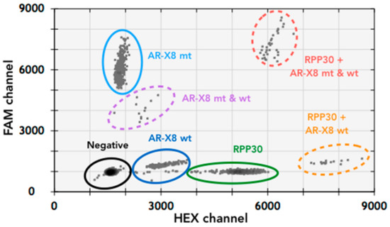 The following are available online at https://www.mdpi.com/article/10.3390/jcm11010257/s1, Table S1: Patient information and raw ddPCR data, Figure S1: Optimization of AR-Amp-2 with various concentrations of primers and probes for TBP, MYM (A,C) and AR-X1, AR-X2(B). Figure S2: Dot plots showing the comparison of amplification positive with negative patients and healthy controls with two methods. p < 0.0005.