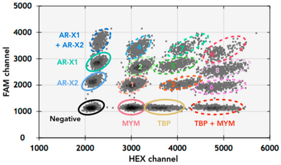 Two-dimensional plot of multiplexed AR-Amp-2 ddPCR assay. The individual droplet clusters demonstrated good separation of different amplicons as shown in the representative 2D plot. Combination populations are also present: 1: AR-X2 + MYM; 2: AR-X1 + MYM; 3: TBP + AR-X2; 4: AR-X1 + X2 + MYM; 5: AR-X1 + TBP; 6: AR-X2 + TBP + MYM; 7: AR-X1 + X2 + TBP; 8: AR-X1 + TBP + MYM; 9: AR-X1 + X2 + TBP + MYM. Note that the appearance of combination populations is dependent on DNA input and chance of co-localization of templates within the same droplets.