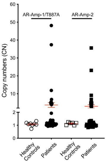 AR CN of 6–8 healthy controls and 47 PC patients. CN was calculated as described in the Materials and Methods section. Circles: AR-Amp-1/T877A; squares: AR-Amp-2; open circles/squares: healthy blood donors; solid circles/squares: patients; error bars in red: mean ± SEM.