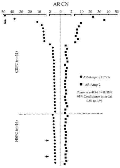 Side-by-side scatter dot plot demonstrating cross-validation of AR CN between AR-Amp-1/T877A (solid circles) and AR-Amp-2 (solid squares) separated into HSPC vs. CRPC patient groups. Patient sample data are sorted by CN value measured by the AR-Amp-1/T877A method. Arrows indicate patient samples with identified T877A mutation, double arrows indicate patients with large scale Chromosome X CN increase.