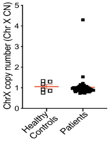 Chr X CN of 6 healthy controls and 47 PC patients as determined with AR-Amp-2 method. The threshold was set at 2. Chr X: X chromosome.