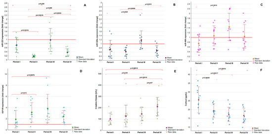 The levels of three miRNAs (miR-223, miR-320a, and miR-486) were significantly different between the training periods (p < 0.0001, p = 0.00021, and p = 0.0037, respectively). MiR-223 showed a variable quantity between the intervals. After the first period (baseline), the concentration was decreased; however, in the third period it increased and then in period IV, decreased again. MiR-320a showed only elevated concentration in the third period. MiR-486 level showed an increasing trend during the training, but only significant changes were observed between the first and third periods (p = 0.0018). The levels of IGF1R showed to be different between the trainings (p = 0.00092), and expression of the mentioned gene showed a trend to increase between the first and third periods. In the fourth period, its expression was decreased, although it was higher compared with the baseline. Creatine kinase levels increased during the training (p < 0.0001), opposite to cortisol levels, which decreased (p < 0.0001). The detailed results are presented in Table 1. The graphical representation of differences in mentioned variables between periods is shown in Figure 1.