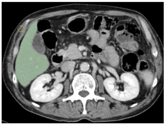 The image acquisition phase regarded the CT scan portal phase, while all other phases were excluded. The program analyzed images without symbols or other patterns detectable at the naked-eye view, as shown in Figure 1. Regions Of Interest (ROIs) were manually defined, checked, and reviewed on a 3D-Slicer by trained physicians [32].