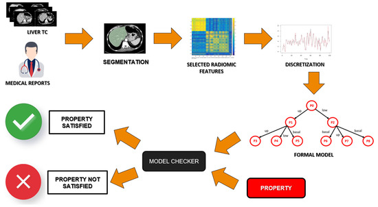 FMs are based on Milner’s algebra [36], which is a mathematical logic currently used to build a model that gathers all the information of the state of health of a single patient. Then, these models must be verified through a formal verification agent, the Model Checker [37]. In Figure 3, a schema of the used approach is shown. Starting from the radiological images, these are segmented and discretized according to some selected radiomic features. Once these features are translated into a formal model of the health status of a patient, the Model Checker agent will verify, on that model, if the property representing the disease is present.