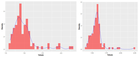 Statistical distributions of “metastatic patients” (left) and “healthy patients” (right). The blue line shows the trend of distribution of feature values.
