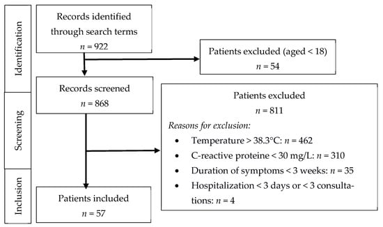 Patient records were retrieved from the Hospices Civils de Lyon software search engine, using the keywords « inflammatory syndrome » AND « prolonged » AND « unexplained », or « prolonged inflammatory syndrome », or « inflammatory syndrome » AND « persistent », or « unexplained inflammatory syndrome ».