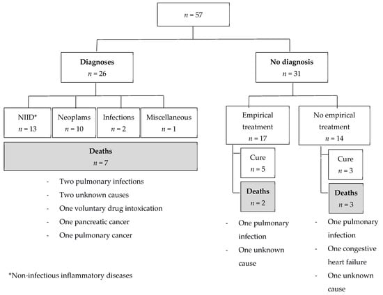 The aim of the present study was to describe: (1) the diagnosis distribution, (2) the contribution of additional investigations, especially the diagnostic value of 18-FDG-PET/CT, and (3) the outcomes, such as mortality rate, cure rate, and effect of the empirical treatments.