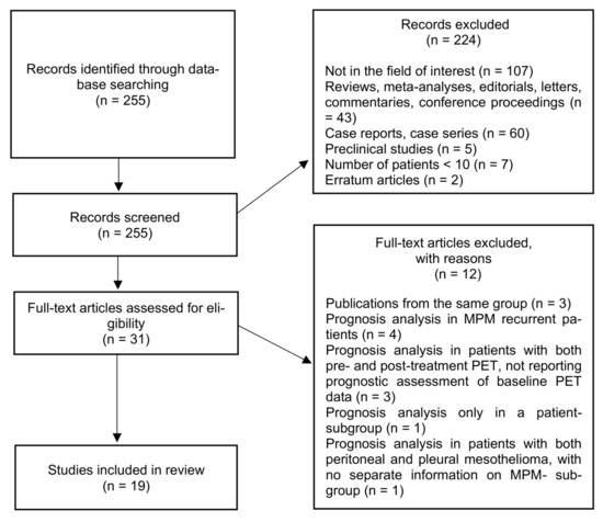 The research flowchart is presented in Figure 1. From initial literature research, 255 studies were retrieved. After screening titles and abstracts, 224 studies were excluded. Analyzing the full-text version of the remaining 31 studies, there were 12 excluded (4 articles including patients with MPM recurrence); 3 articles from the same referring center; 3 articles including MPM patients with both baseline (pre-treatment) and post-treatment PET, but not reporting prognostic analysis of baseline PET data; 1study with a prognostic analysis performed only in a subgroup population; and 1 article including patients with both peritoneal and pleural mesothelioma, with no separate information on MPM subgroup). Finally, 19 studies were included and analyzed in this review [29,32,33,34,35,37,38,39,40,41,42,43,44,45,46,47,48,49,50].