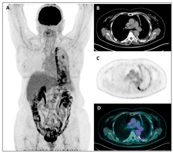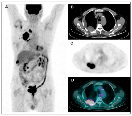Maximum Intensity Projection—MIP (A), coregistered low-dose CT (B), 18F-FDG PET (C), and fused PET/CT (D). Images in a male patient with multiple right pleural thickenings showing high tracer uptake along with pleural effusion: the largest and most active lesion is located in the posterior side of costal pleura, as shown in the figure. Afterwards, the patient underwent VATS and pleural sampling with diagnosis of diffuse bi-phasic MPM.