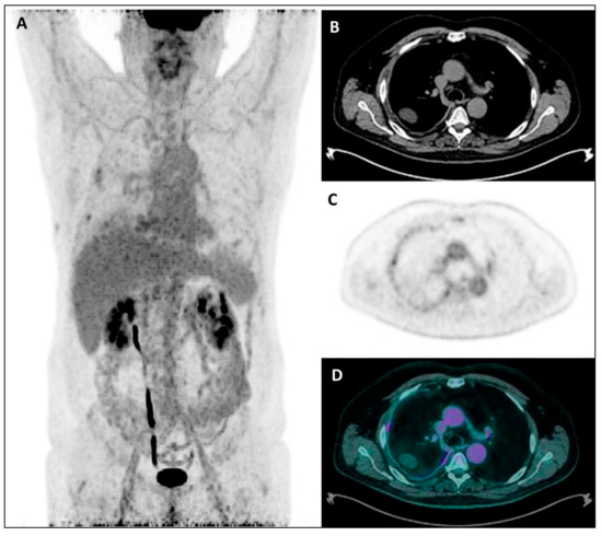 Maximum Intensity Projection—MIP (A), coregistered low-dose CT (B), 18F-FDG PET (C), and fused PET/CT images (D) in a male patient with diffuse right pleural thickening; only a low inhomogeneous tracer uptake was evident, along with pleural effusion. Subsequently, the patient underwent right pleurectomy with histological evidence of a diffuse epithelioid MPM.