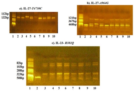 Agarose gel electrophoresis for identification of the genotypes for IL-27-T4730C, IL-27-A964G and IL-23-R381Q polymorphisms. (a). IL-27-T4730C: Lane 1—pBRHaeIII Digest DNA molecular marker V; Lane 2, 3, 7, 8, 10—TT genotype: fragment of 132bp; Lane 4, 6—CC genotype: fragment of 112bp; Lane 5, 9—TC genotype: fragments of 132 and 112bp; (b). IL-27-A964G: Lane 1—pBRHaeIII Digest DNA molecular marker V; Lane 2, 6—AA genotype: fragment of 468 bp; Lane 3, 5, 7, 8, 9, 10—AG genotype: fragments of 468 bp, 367 bp, 121 bp; Lane 4—GG genotype: fragments of 367 bp and 121bp; (c). IL-23-R381Q: Lane 1—pBRHaeIII Digest DNA molecular marker V; Lane 2—PCR: fragment of 508 bp; Lane 3-9—GG genotype: fragments of 288 bp, 103 bp, 82 bp; Lane 10—AG genotype: fragments of 323 bp, 288 bp, 103 bp, 82 bp.