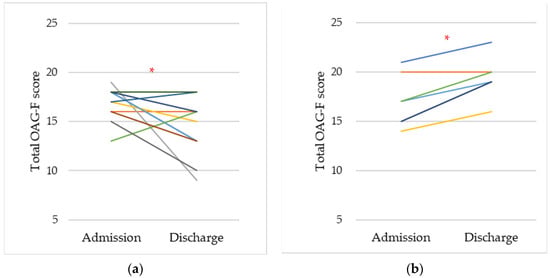 The change in the total OAG-F score between admission and discharge. (a) Survivors. (b) Non-survivors. * Asterisk indicates a statistically significant difference (p < 0.05).