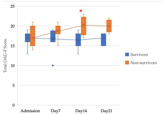 The time-course changes in the total OAG-F score. (Admission) Survivors: n = 12, Non-survivors: n = 7. (Day 7) Survivors: n = 12, Non-survivors: n = 7. (Day 14) Survivors: n = 7, Non-survivors: n = 6. (Day 21) Survivors: n= 3, Non-survivors: n = 5. * Asterisk indicates a statistically significant difference (p < 0.05).