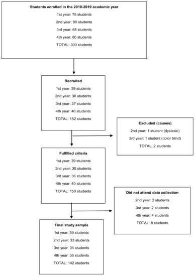 All students enrolled in the 2018–2019 academic year at the Faculty of Nursing of a University in the northern Spain aged between 18 and 30 years were included in the study. Those with sensory deficits or diseases that prevented the performance of the neuropsychological tests were excluded. Of 303 students enrolled, 142 finally participated in the study (Figure 1).