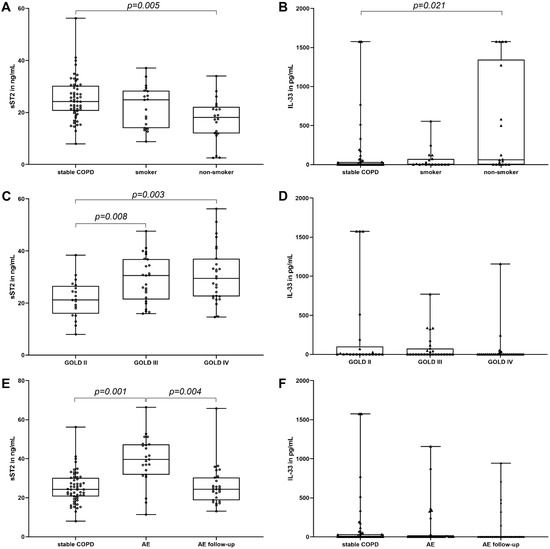 Levels of sST2 were overall higher in COPD versus non-smoking controls (24.2 ng/mL, interquartile range (IQR) 20.6–30.2 vs. 18.1 ng/mL, IQR 11.9–22.2, p = 0.005, Figure 1A) and increased with increasing levels by GOLD stage (Figure 1C). Furthermore, acute exacerbated COPD patients showed elevated sST2 levels compared to stable COPD (39.59 ng/mL, IQR 31.77–44.33 vs. 24.2 ng/mL, IQR 20.6–30.2, p = 0.001, Figure 1E). Following acute exacerbation, circulating sST2 concentration returns to baseline levels (24.36 ng/mL, IQR 18.8–30.3, p = 0.004, as compared to acute exacerbation, Figure 1E). IL-33 was higher in non-smokers (61.09 pg/mL, IQR 0–1346.06) as compared to stable COPD (0 pg/mL, IQR 0–33.99, p = 0.021), and there was a tendency, as compared to smokers, but it did not reach statistical significance (4.08 pg/mL, IQR 0–72.53, p = 0.860, Figure 1B). Patients with COPD had comparable IL-33 levels regardless of disease severity (GOLD 2: 0 pg/mL, IQR 0–99.12 vs. GOLD 3: 0 pg/mL, IQR 0–74.67 vs. GOLD 4: 0 pg/mL, IQR 0–0.55, p = 0.185, Figure 1D). IL-33 was below detection limit in 36 (61%) patients with stable COPD and in 21 (72%) exacerbated patients.