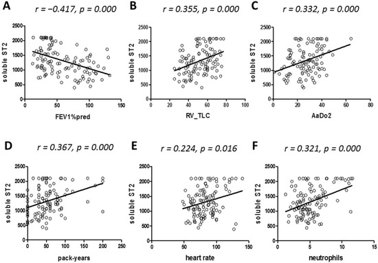 Determinants of soluble ST2 in COPD patients and healthy controls. Univariate correlations between soluble ST2 (in ng/mL) and FEV1% predicted (panel A), RV and TLC (in L/L) (panel B), AaDO2 (in mmHg) (panel C), pack-years (panel D), heart rate (in bpm) (panel E) and neutrophil count (in G/L) (panel F) in the entire study sample (n = 118). Circulating sST2 was measured as described in the Methods section; p-values < 0.05 were considered significant.
