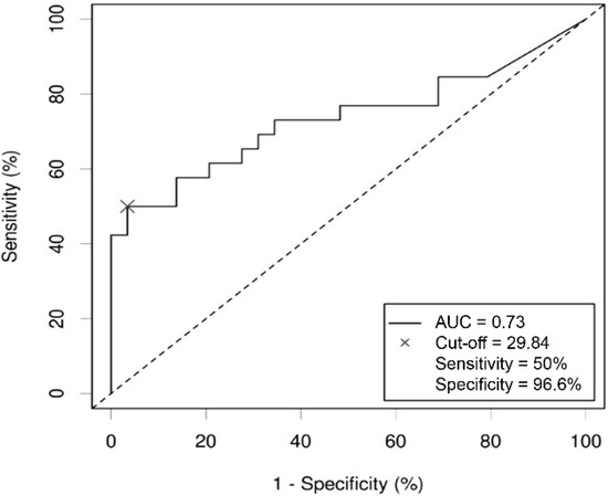 sST2 was above the calculated threshold of 29.84 ng/mL in 14 COPD patients (23.7%). In the Kaplan–Meier survival plots, sST2 above the cut-off was associated with higher mortality rates as compared to sST2 below the cut-off (log-rank: p < 0.001, Figure 3). sST2 predicted mortality with 96.6% specificity and 50% sensitivity and an AUC of 0.73 (Figure 4). Furthermore, when sST2 was added to a model with age, sex, pack-years, FEV1% predicted and CRP, the Harrell’s C-index AUC for prediction of all-cause mortality improved from 0.69 (95% CI 0.59–0.80) to 0.79 (95% CI 0.71–0.87, p = 0.036, Table 4).