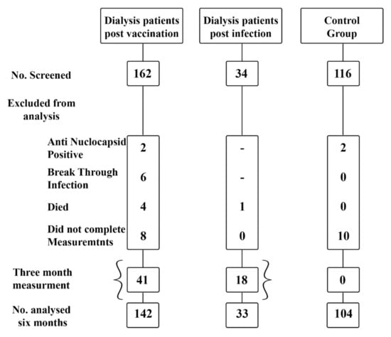 Figure 1. Flow Chart of the studied dialysis patients and healthy controls. The current observational study included 142 dialysis patients who completed 2 doses of the BNT162b2 mRNA SAR S-COV-2 vaccine at 1, 3 and 6 months and after the second vaccine dose were measured. We also measured SARS-COV-2 anti-spike antibody levels in dialysis patients who were infected with COVD-19 (n = 33) as well as a control group of healthcare-employees (n = 104).