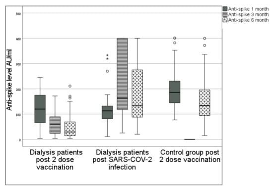 Vaccinated dialysis patients had lower anti-spike antibody levels at 1, 3 and 6 months post vaccination when compared to a control group and to dialysis patients who had the COVID-19 infection. The median level in this group was very low at 6 months.