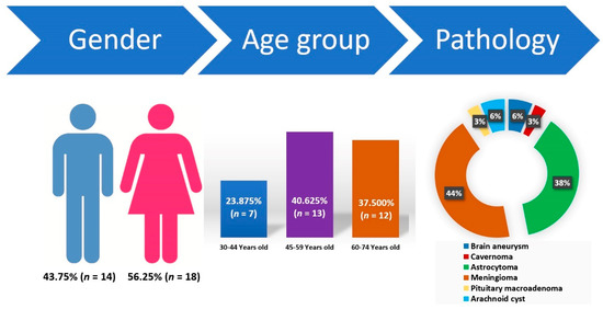 Among the thirty-two enrolled patients, 56.25% (n = 18) were females and 43.75% (n = 14) were males, with an age range between 30 and 74 years old, mean 53.94 (±12.68). The pathology was divided as follows: cerebrovascular lesions—9.375% (brain aneurysm—n = 2 patients, cavernoma—n = 1) and cerebral tumors—90.625% (astrocytoma—n = 12, meningioma—n = 14, pituitary macroadenoma—n = 1, arachnoid cyst—n = 2) (Figure 1).