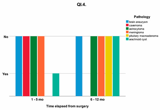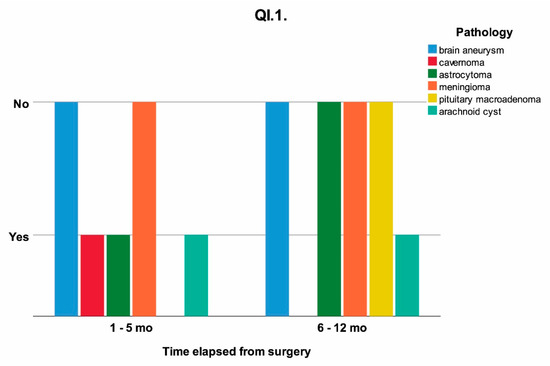 The response at QI.1 (“Do you feel pain in your temple or in the anterior region of the ear when you yawn?”) influenced by the time elapsed from surgery clustered on the initial pathology; mo = months.