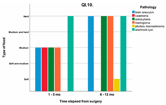 The response at QI.10 (“Please choose from the list what food could you chew without having pain on the affected side”) influenced by the time elapsed from surgery clustered on the initial pathology mo = months.