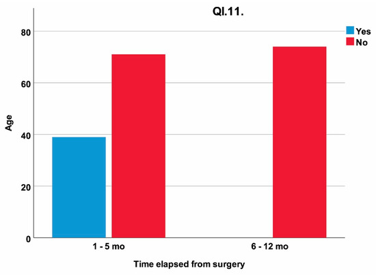 The influence of patient’s age and time elapsed from surgery on the response at QI.11 (“Do you feel pain when moving your lower jaw back and forward, without opening your mouth?”); mo = months.