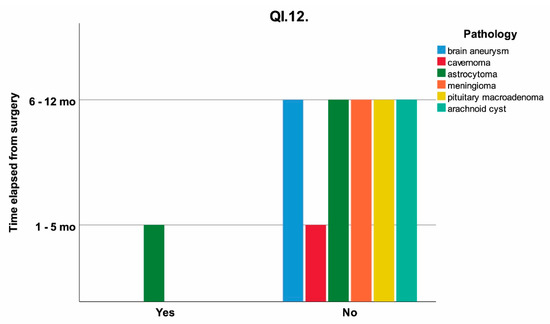The influence of time elapsed from surgery on the response at QI.12 (“If you open wide and then gradually close your mouth, do you feel pain on the affected side?”) clustered on pathology; mo = months.