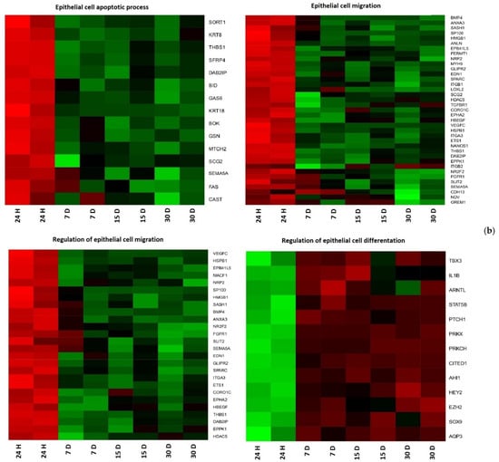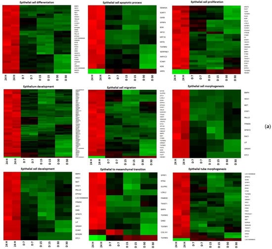 Human ovarian granulosa and cumulus cells long-term in vitro culture and gene expression analysis allowed us to study, on a large scale, a wide group of 168 genes belonging to ontological groups characterizing epithelial cell physiological processes. The main focus was on: “Epithelial cell apoptotic process” and “Epithelial cell migration” ontology groups in GCs and CCs; “Epithelial cell development”, “Epithelial cell differentiation”, “Epithelial cell morphogenesis”, “Epithelial cell proliferation”, “Epithelial to mesenchymal transition”, “Epithelial tube morphogenesis”, “Epithelium development” in CCs; and “Regulation of epithelial cell differentiation” or “Regulation of epithelial cell migration” in GCs. The samples analyzed were isolated on the 1st, 7th, 15th, and 30th day of culture.