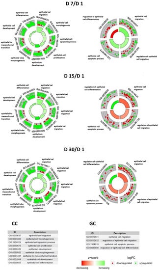 The objective of the current study was to identify genes whose expression may indicate the OSE origin of GCs and CCs. Additionally, epithelial stem cells exhibit active proliferation of tubal epithelial cells and an increase in the expression of genes involved in tube morphogenesis in vitro []. Microarray expression technology was used following previous studies published by Ożegowska et al. [], which analyze gene expression in porcine oocytes before and after maturation. Involved in epithelial processes, genes expression analysis was carried out on the basis of a 30-day in vitro culture model. Granulosa cells’ long-term in vitro cultivation carried out outside the organism can reveal the primary functions and biological origin of these cells. Additionally, the 30-day in vitro culture of CCs and GCs may reveal the directions in which these cells can differentiate under laboratory conditions [,].