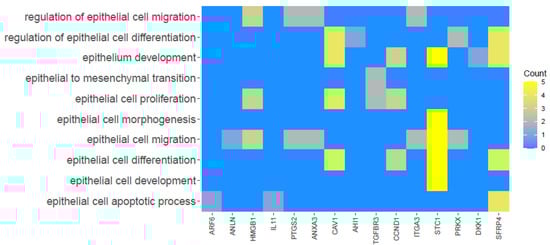 The DAVID software analysis showed that differentially expressed genes belong to 657 Gene ontology terms for human cumulus cells and 582 Gene ontology terms for human granulosa cells. A total of 98 differentially expressed genes from human cumulus cells that identifies “epithelial cell apoptotic process”, “epithelial cell development”, “epithelial cell differentiation”, “epithelial cell migration”, “epithelial cell morphogenesis”, “epithelial cell proliferation”, “epithelial to mesenchymal transition”, “epithelial tube morphogenesis” and “epithelium development” GO BP terms undertook a more detailed examination. Similarly, 72 differentially expressed genes from human granulosa cells that belong to “epithelial cell apoptotic process”, “regulation of epithelial cell differentiation” and “regulation of epithelial cell migration” GO BP terms were evaluated.