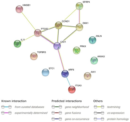 Interactions between the protein products of the 15 differentially expressed genes are presented in Figure 4.