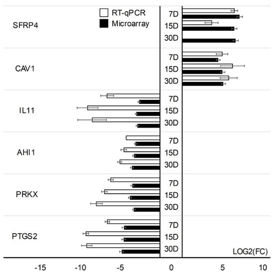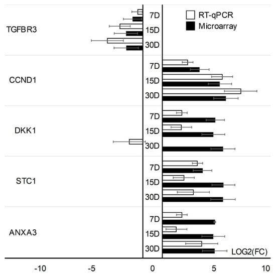 RT−qPCR validation of microarray change expressions (log(FC)) in CCs. Validation of the microarray method was performed in three separate biological repetitions. Each of the biological repetitions was performed in three technical repetitions; D: day of culture; FC: fold change.
