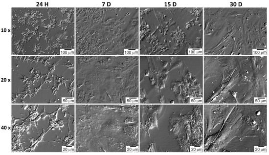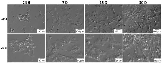 The 30-day cell culture protocol allows for an accurate understanding of cell properties in new in vitro conditions. The 0 point (24 h) corresponds approximately to the physiological properties of cells [], while the following days show the changes that occur in culture. The 7th day defines the short-term culture, the 15th day reflects changes after the first passage, while day 30 is the end of long-term culture []. CC and GC long-term in vitro cultures can also show us the direction of their progression in laboratory conditions [,]. It also seems interesting to correlate the growth and differentiation of these cells in in vitro conditions with their in vivo behavior.