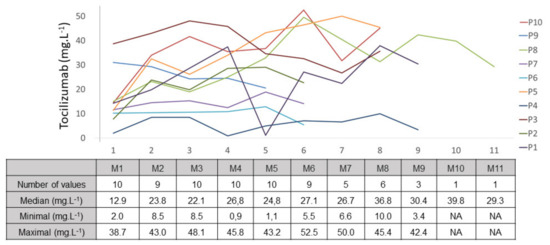 - Truffot, A.; Gautier-Veyret, E.; Baillet, A.; Jourdil, J.; Stanke-Labesque, F.; Gottenberg, J. Variability of rituximab and tocilizumab trough concentrations in patients with rheumatoid arthritis. Fundam. Clin. Pharmacol. 2021, 35, 1090–1099. [Google Scholar] [CrossRef] [PubMed]