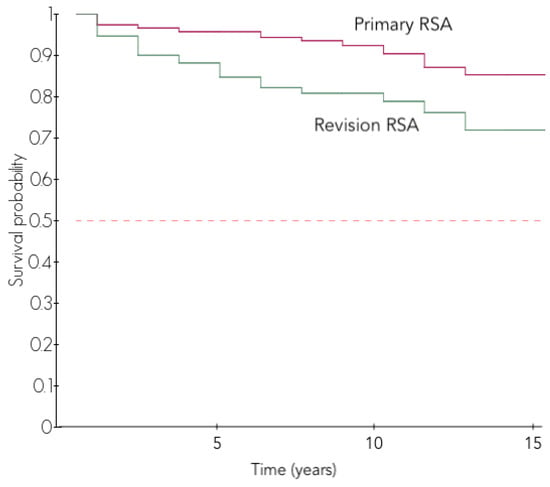 Revision RSA was associated with a lower survival at every time point compared to primary RSA (80.4% vs. 91.0% at 10 years, p = 0.002), as reported by other authors in previous studies [6,24,25]. Saltzman et al. [25] found that the revision status was the most significant predictor of intraoperative and postoperative complications in a retrospective series of 137 patients. Zumstein et al. [20] reported a complication rate that was more than twice as high in cases of revision compared to primary RSAs (33% vs. 13%). Although revision RSA is sometimes the only solution after a failed unconstrained arthroplasty, surgeons should be aware that it is a challenging surgery with high rates of complications and revision surgeries. The main complication in a revision RSA is a low-grade infection.