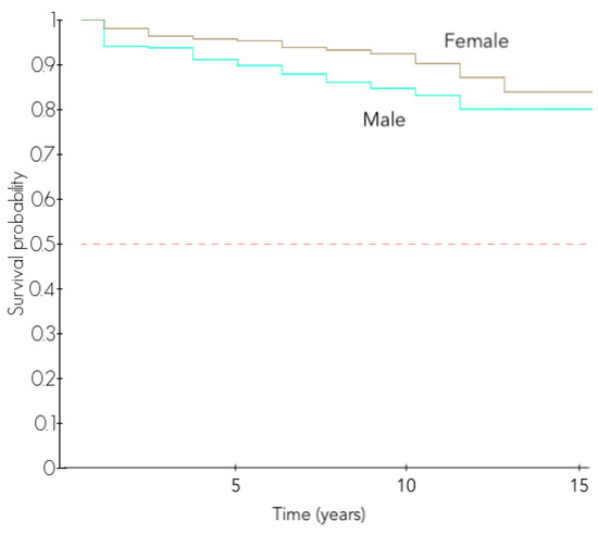 The rates of complications and revision surgeries were higher in male patients: the 5-year and 10-year revision-free survivals were 90.3% and 83.2% in male patients and 95.4% and 91.5% in female patients (p < 0.001, Table 4 and Table 5, Figure 2).