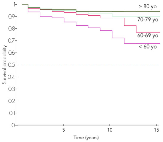 Numeric outcomes were expressed by their mean (±standard deviation), and discrete outcomes were expressed by their absolute and relative frequencies (%). The Fisher’s exact test was used for between-group comparisons. We used the Kaplan–Meier method to estimate the survival probabilities and their pointwise 95% confidence intervals. The log-rank non-parametric test was used to compare the survival distributions. The significance was set at p < 0.05. Statistical analysis was performed with EasyMedStat (www.easymedstat.com; version 2.0, France) (accessed on 12 March 2018).