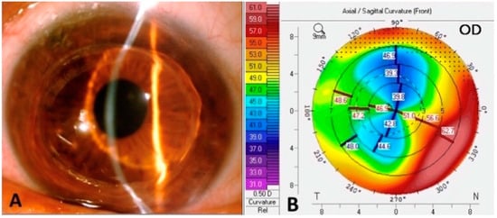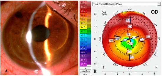 The diagnosis of post-PK corneal ectasia is usually based not only on patient history and symptoms, but also on characteristic findings on photo-keratometry, topography, and tomography [17]. Although a unique keratometry value does not define ectasia, photo-keratometry can provide clues in detecting early peripheral abnormalities in the wound interface, showing widening of the mires and greater distance between the rings [13]. Topography allows quantitative measurements of the corneal astigmatism across the whole corneal surface. Repeated exams carry a relevant value in the diagnosis of progression of ectasia with a wide range of astigmatism ranging between 2.5 and 12 D [10]. Astigmatism is usually irregular with asymmetric bowing or with a distinctive pattern. Topography of the anterior surface of the cornea is essential because it forms the foundation of all diagnoses of ectasia based on indices and scores. However, topography does not provide corneal thickness measurements that contribute to diagnosing and managing advanced corneal ectasia (Figure 2 and Figure 3) [8].
