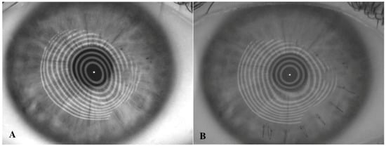 Placido image of pre (A) and post-operatory (B) of cornea ectasia treated with wedge resection and compressive sutures.