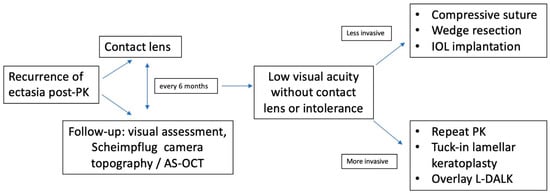 Algorithm for management and correction of post penetrating keratoplasty corneal ectasia. AS-OCT = Anterior segment optical coherence tomography; IOL = intraocular lens; PK = penetrating keratoplasty; L-DALK = Large-diameter deep anterior lamellar keratoplasty.