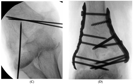 In the case of the combined mediolateral approach, as in Wei et al. [18], the medial incision was performed first and the ulnar nerve was identified but not released. A reduction clamp was used to hold the medial side of the proximal and distal fragments, and one or two Kirschner wires were used for temporary fixation. Subsequently, the lateral side of the fracture fragment was approached through a lateral incision and temporary fixation was performed in the same way, and then a 3.5 LCP distal humerus plate (DuPey Synthes, West Chester, PA, USA) was applied either orthogonally or parallelly (Figure 2A–D).